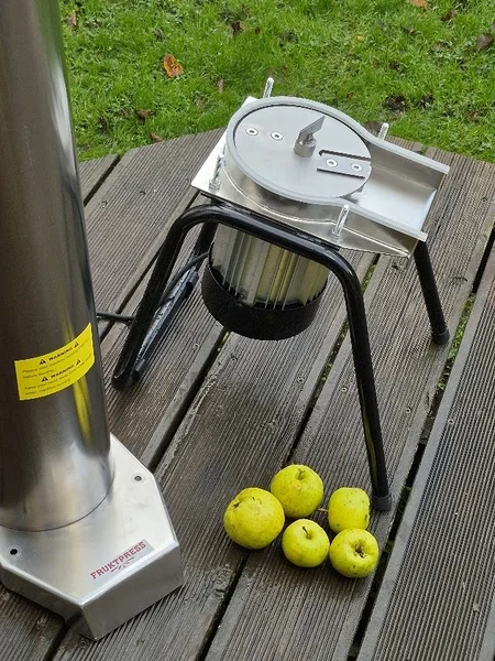 Den rostfria krossen har en extra bred tratt, vilket gör att äpplen kan hällas direkt från hinken.