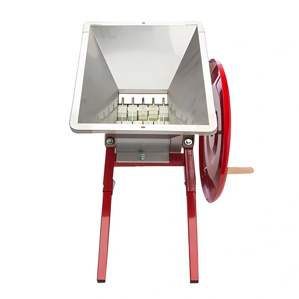 Tack vare det stora vevhjulet skapas ett stort moment, vilket gör att det inte krävs fysisk styrka för att krossa frukten snabbt och effektivt. Vassa och kraftiga knivar fångar frukten och kör den igenom valsarna.