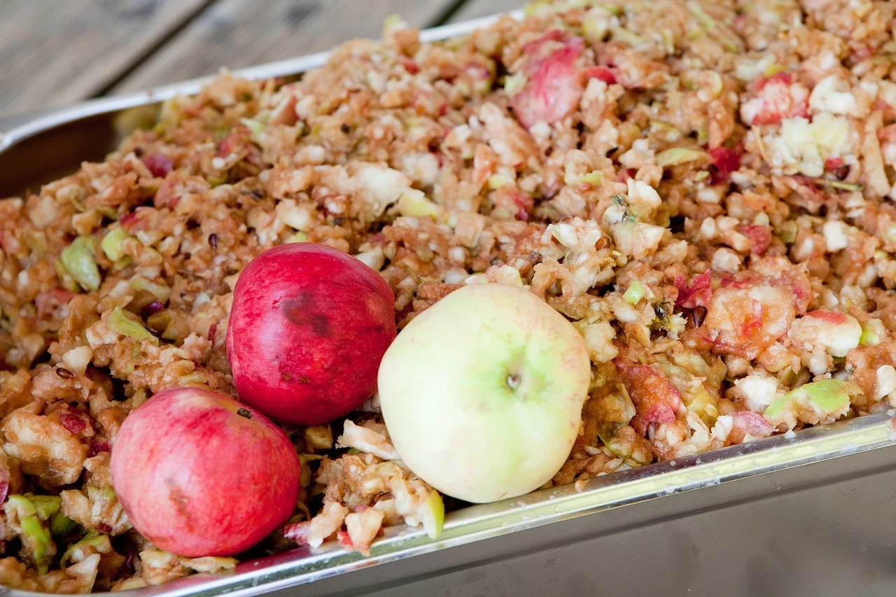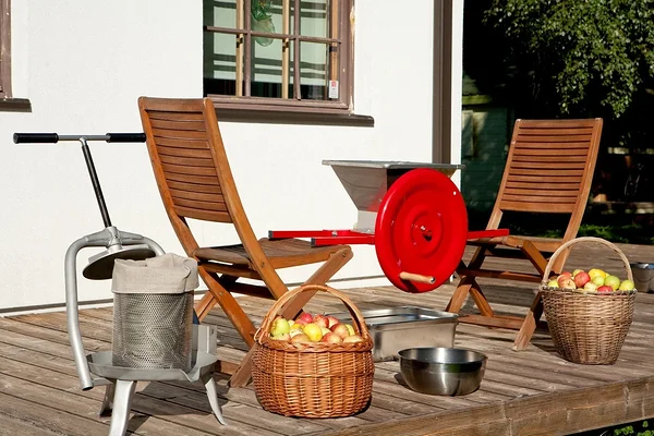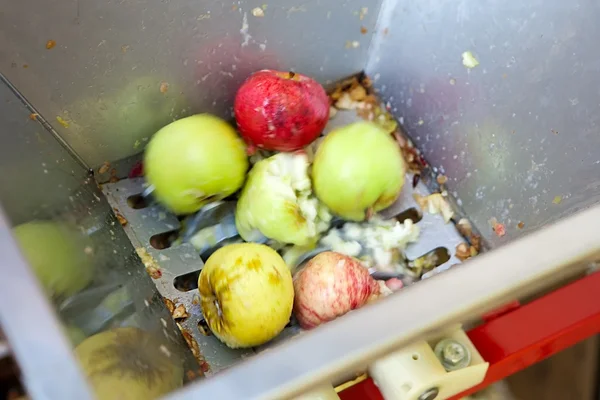 Det behövs ungefär en timme för två personer att bearbeta 100 kg äpplen. En person vrider veven, den andra lägger i äpplena.