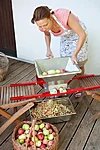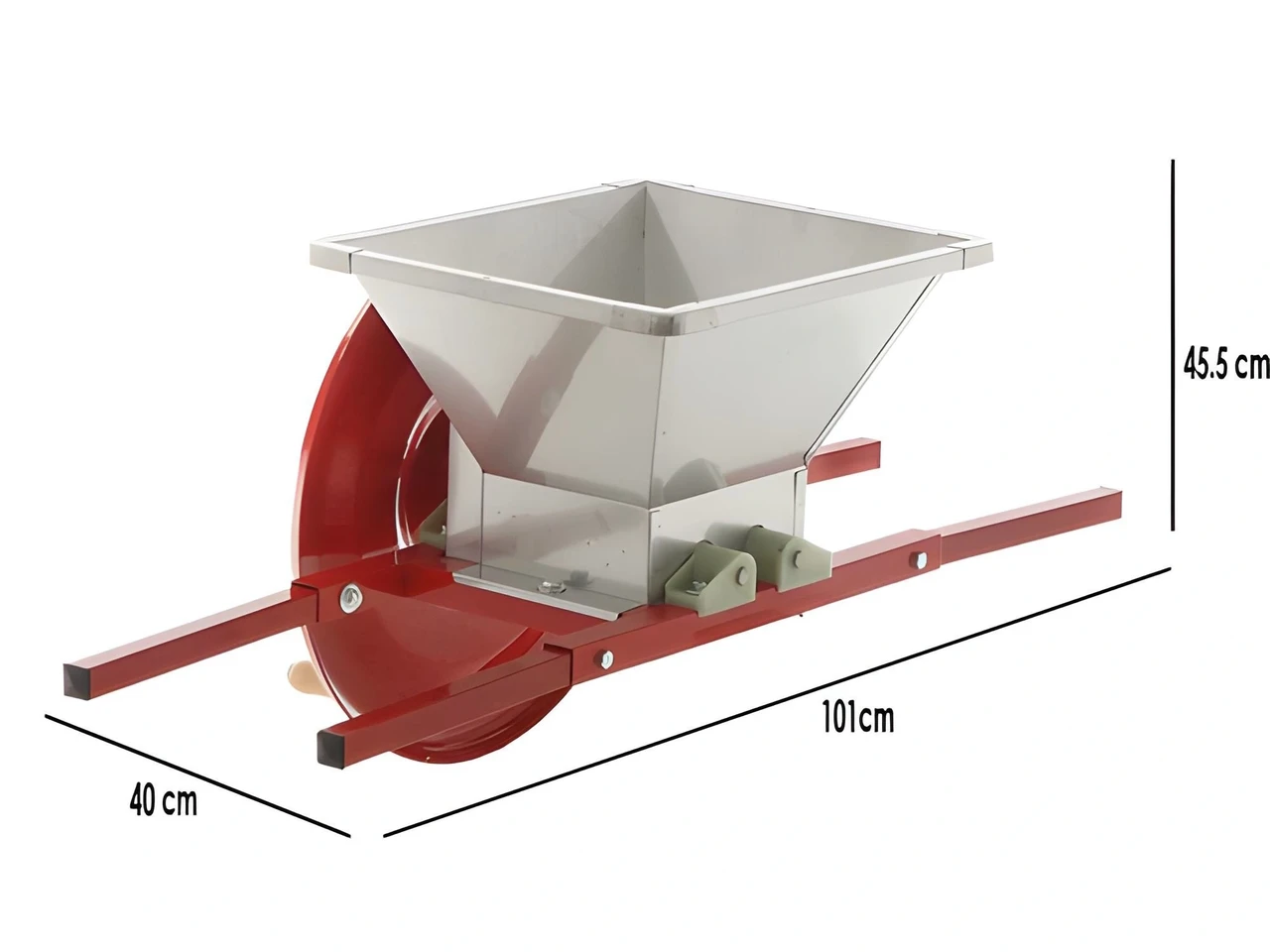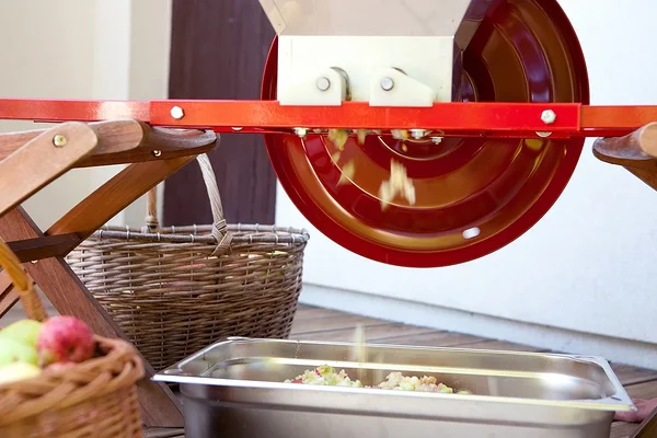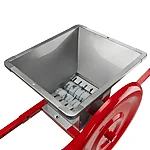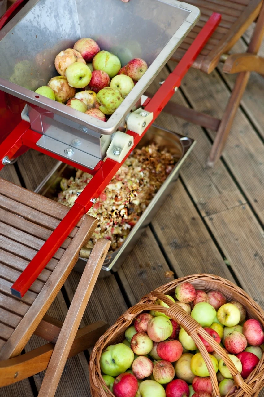 Äppelkrossen är otroligt enkel att använda. Man fyller tratten med äpplen och bara vevar på det massiva svänghjulet så att äpplena fångas av knivarna och körs igenom valsarna - därmed finkrossas äpplena och hamnar i ett kärl som står under krossen. Det är verkligen den bästa manuella fruktkrossen som finns!