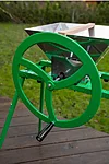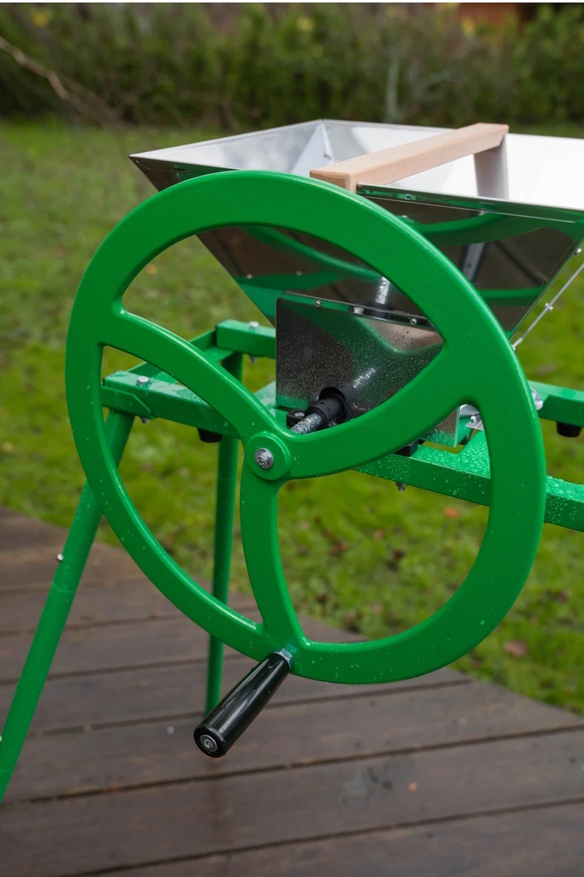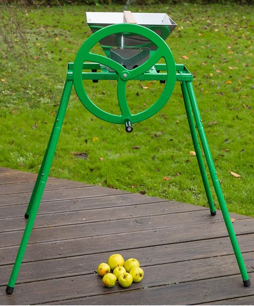 Denna enkla och bekväma manuella fruktkvarn med kraftigt svänghjul är effektiv och bra för att krossa äpplen.