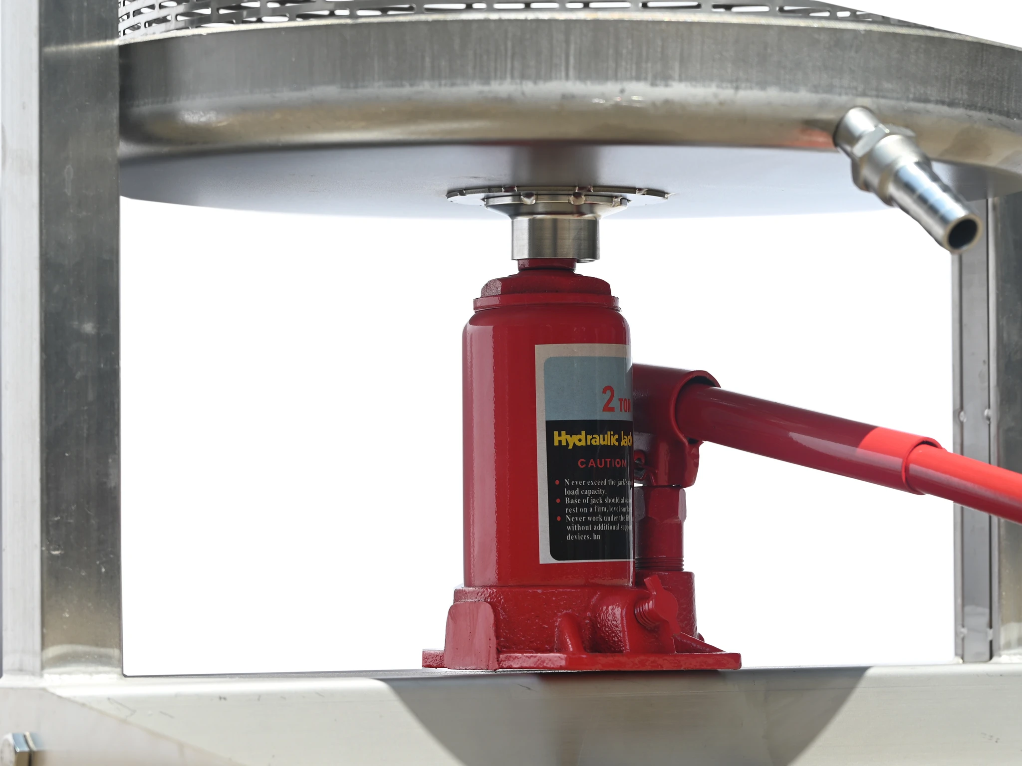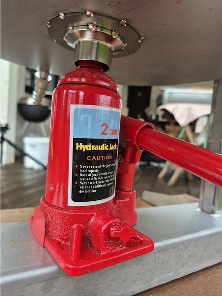 Pressning: Pumpa långsamt med domkraften. Genom att öka trycket gradvis hinner juicen rinna undan effektivt genom perforeringen och ut via uppsamlingsrännan.