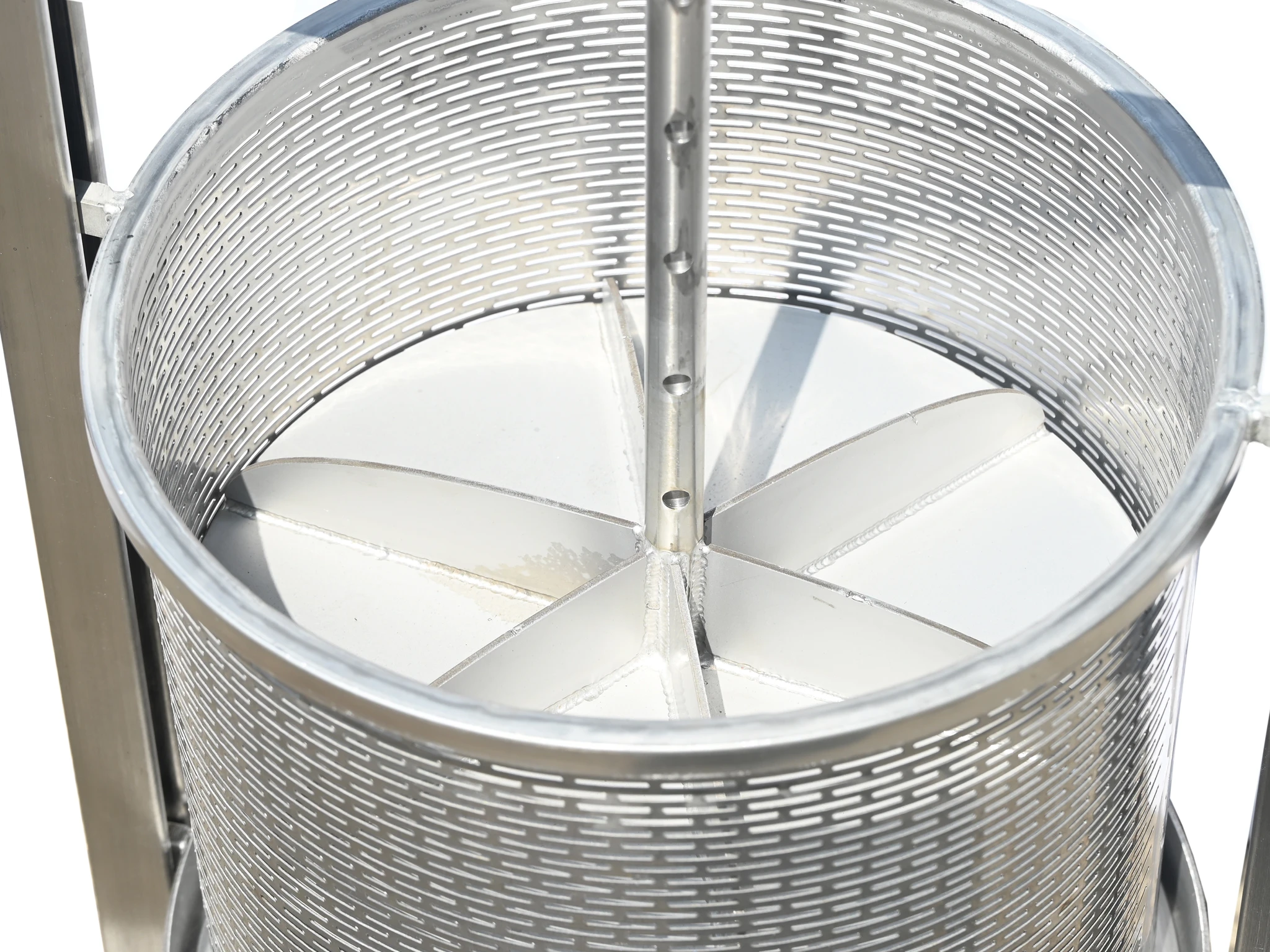 Det rostfria stålet gör underhållet smidigt. Spola av korgen, pressplattan och rännan med rent vatten efter användning. Vid behov kan ett milt, livsmedelsgodkänt rengöringsmedel användas.