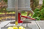 Klargörande: Sväng tillbaka den övre balken och fixera muttrarna. Sänk pressplattan mot frukten och lås den i position med stålpsprinten.