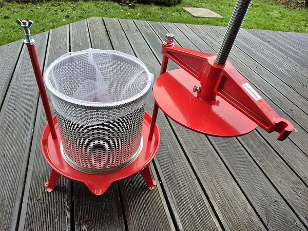 Alla delar som kommer i kontakt med frukt och must, såsom korgen, uppsamlingstallrik och pressplatta, är gjorda för att vara hållbara och lätta att rengöra. Den är den perfekta fruktpressen för småskaligt musttillverkning.