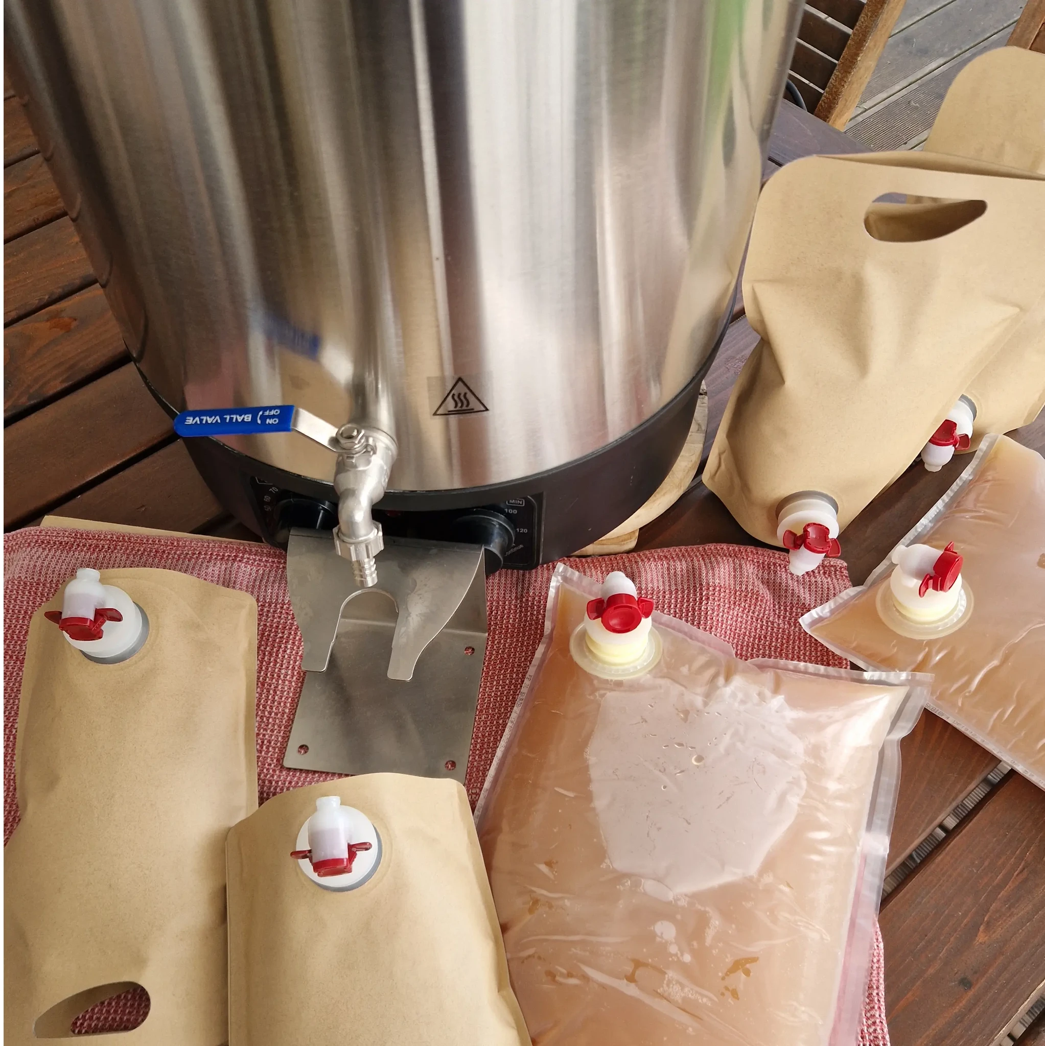 Denna pastöriseringsapparat är otroligt enkel att använda och mycket pålitlig. Med den kan du snabbt och smidigt pastörisera din färskpressade äppelmust och sedan tappa upp den på lämpliga behållare som flaskor, Bag-in-Box- eller Pouch - ståpåsar.